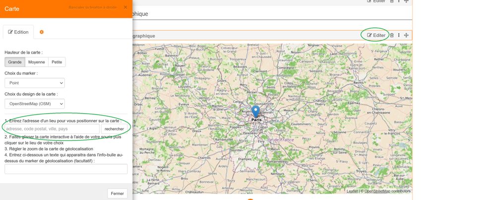 2. L'élément Carte est créé sur la page. Cliquez sur Editer pour modifier celui-ci. Vous pouvez entrer une adresse pour vous géolocaliser plus facilement. Cliquez sur la carte pour indiquer le lieu précis que vous souhaitez indiquer sur votre carte. Régler le niveau de zoom, le type de carte (plan, aérien).