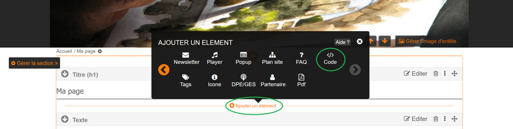 1. Sélectionnez la page où vous souhaitez installer un ou plusieurs player musicaux, puis cliquez sur le lien Ajouter un élément de type Code Html.