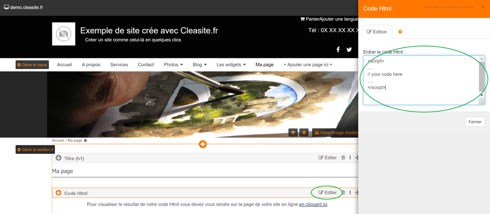 2. Cliquer sur EDiter puis copier/coller votre code (html ou javascript)