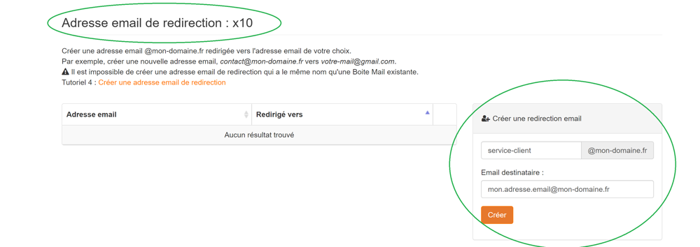 Veuillez saisir l'adresse email de votre choix, par exemple service-client puis entrer l'adresse email sur lequel vous souhaitez rediriger vos emails. Cliquez sur le bouton Valider puis patienter pendant la création de votre adresse email de redirection.