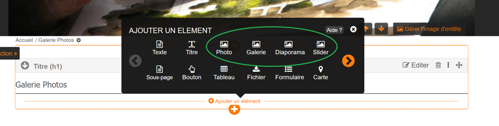 1. Cliquez sur Ajouter un élément puis sélectionner parmi les diffférents type de galerie Photos. Dans notre exemple, nous allons choisir le second choix Galerie.