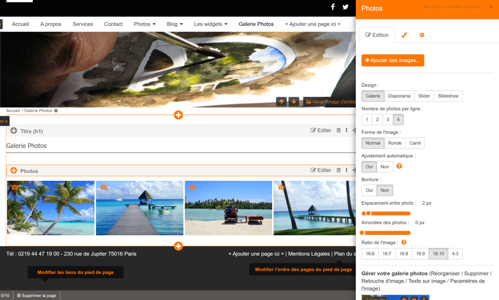 Nous avons téléchargé 4 photos. Vous avez plusieurs choix de paramétrage de votre galerie photos permettant de modifier la forme des images, les bordures, le nombre de photos par ligne, le design de votre galerie, etc... A vous de tester les différents paramétrages selon votre besoin.