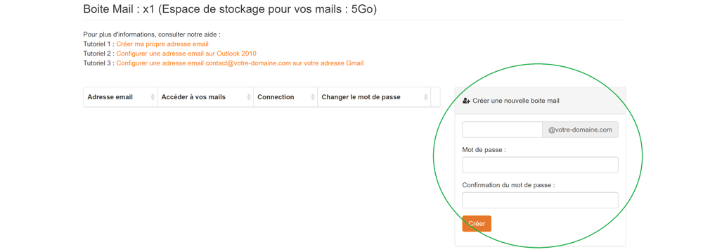 Sur cette page, veuillez saisir l'adresse email de votre choix à partir de l'espace Boite Mail, par exemple contact, un mot de passe puis confirmer votre mot de passe. Cliquez sur le bouton Créer puis patienter pendant la création de votre boite Mail.