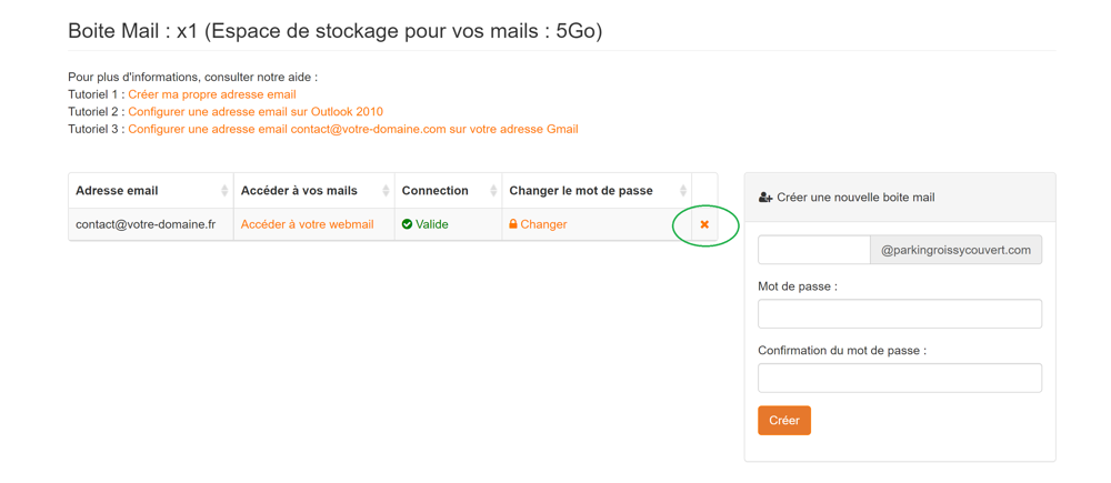 A partir de la liste de vos adresses emails, cliquez sur l'icône X « Supprimer » et validez votre choix.