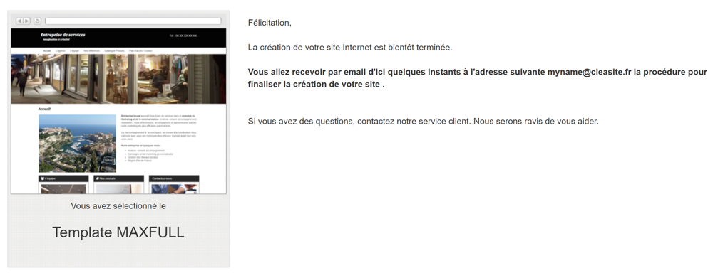 Pour finaliser la création de votre site Internet cliquez sur le bouton "Continuer". Ci-dessous une copie d'écran de la page finale.