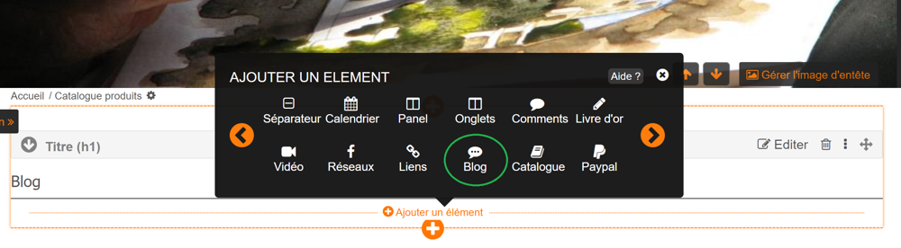 1. Créer une nouvelle page ou aller sur une page existante. Ajouter un nouvel élément de type Blog.