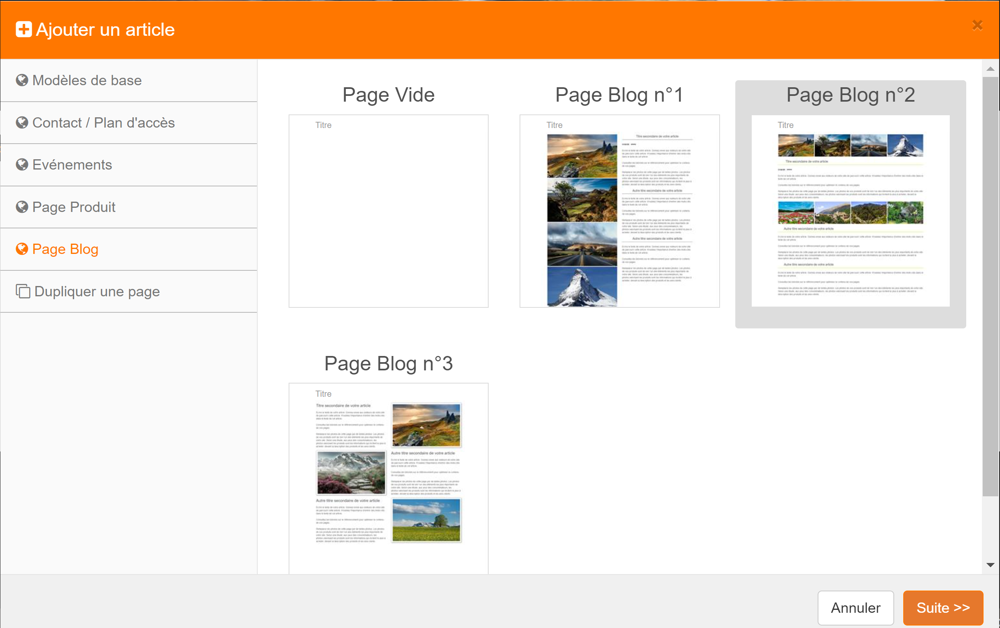 3. Choisir parmi les modèles proposées de la même façon que lors de la création d'une page.