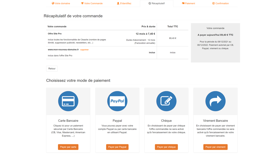 Vous pouvez aussi régler par chèque, virement bancaire ou Paypal. En choisissant de payer par chèque ou virement bancaire l'offre commandée ne sera activé qu'à l'encaissement du montant de la commande.
