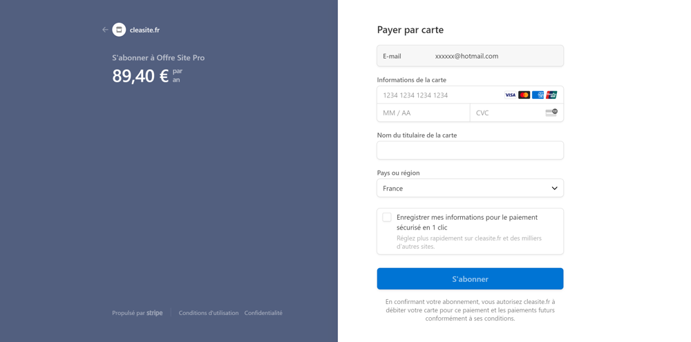 Vous êtes maintenant sur les serveurs sécurisés de Stripe. Entrez vos informations de paiement pour valider le paiement en ligne puis cliquez sur le bouton S'abonner.