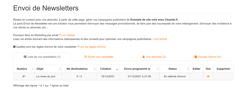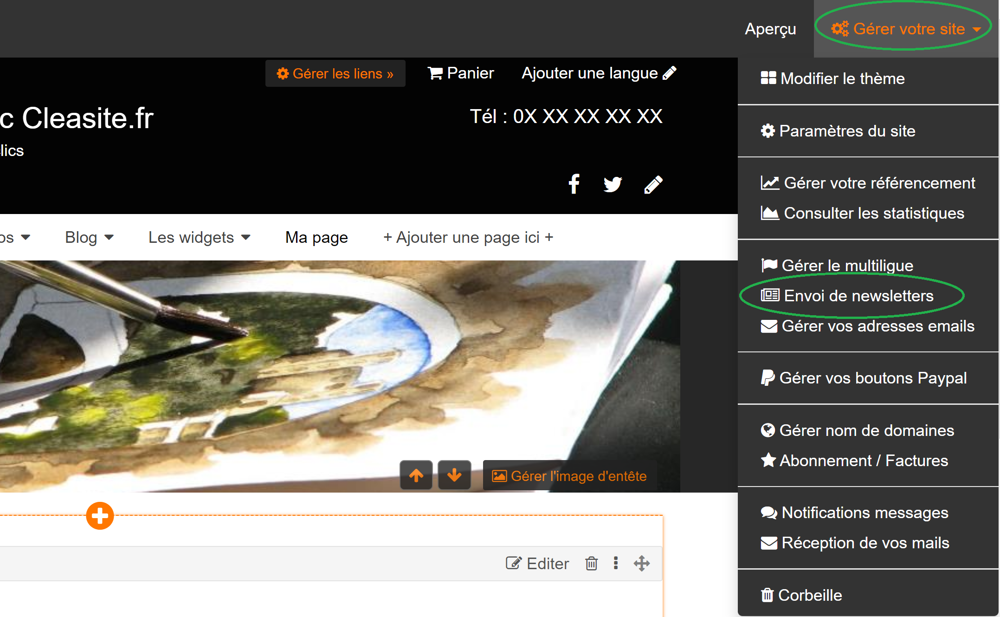 Cliquez sur Gérer votre site > Envoi de newsletters