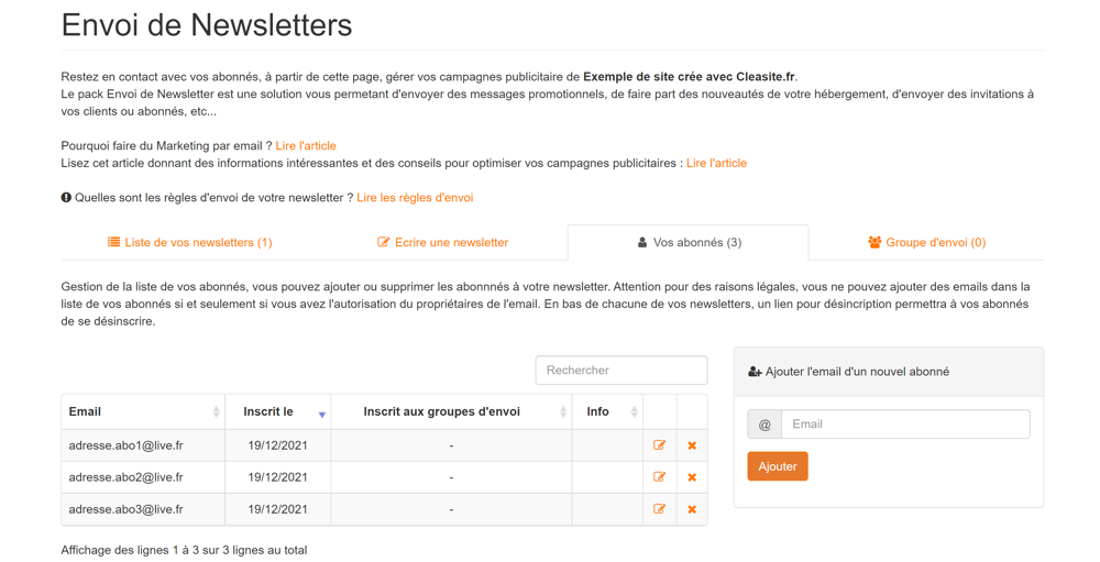 Cliquez sur le troisième onglet pour voir la liste des abonnés à votre site. Dans le cadre bleu à droite, vous pouvez ajouter de nouveaux abonnés.