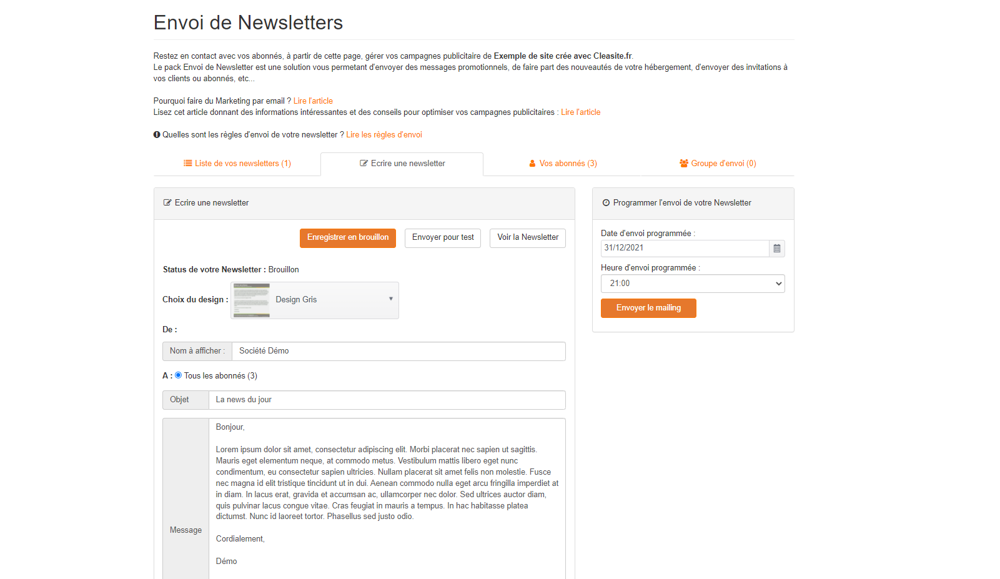 Cliquez sur le deuxième onglet, saisissez l'objet et le message destiné à vos abonnés. 3 actions s'offrent à vous avant d'envoyer votre newsletter.