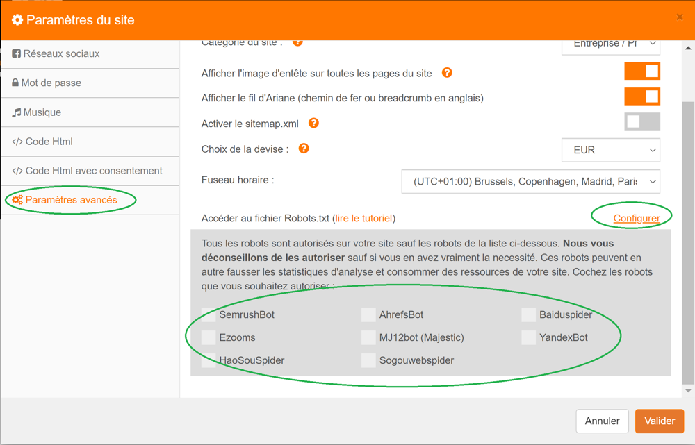 A partir de votre compte, cliquez sur Gérer votre site > Paramètres de votre site > Paramètres avancées > Accéder au fichier Robots.txt et cliquer sur Configurer. Cochez les moteurs d'exploration exclus dont vous souhaitez donner l'accès à votre site.