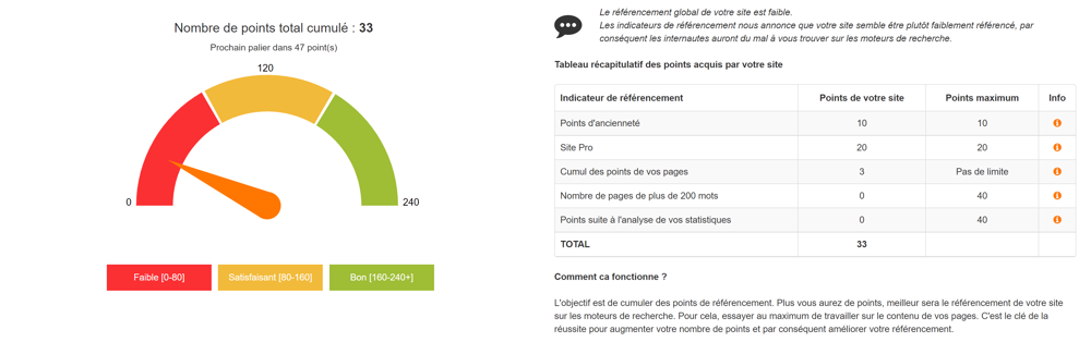 Nous attribuons des points sur l’analyse de vos statistiques. Si votre site est populaire (équivalent à un nombre important de visites) cela signifiera que le référencement de votre site a réussi. De facto, le nombre de points de votre site augmentera dans la limite de 30 points.