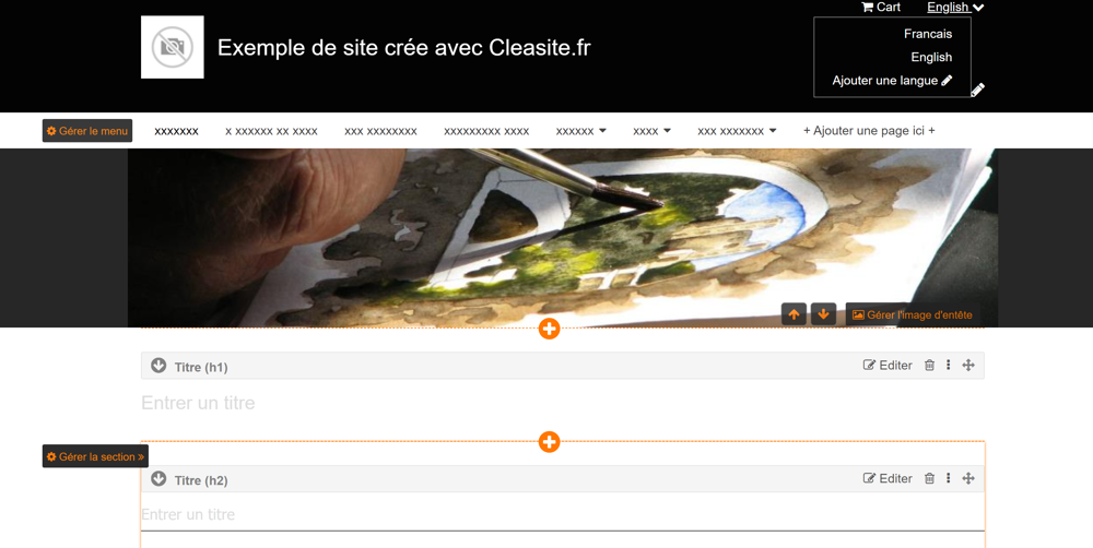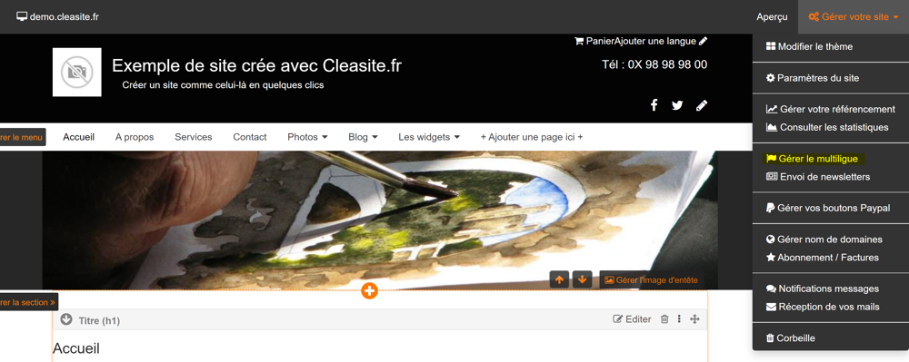 4. Retourner sur votre site puis sélectionner la langue à traduire. Vous pouvez désormais saisir tout le contenu de votre site page par page dans la langue sélectionnée. Il faudra aussi traduire les menus (en cliquant sur Gérer le menu) et les noms des pages (Paramètre de votre page en bas à droite).