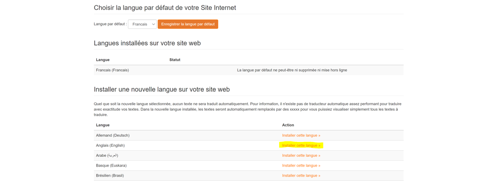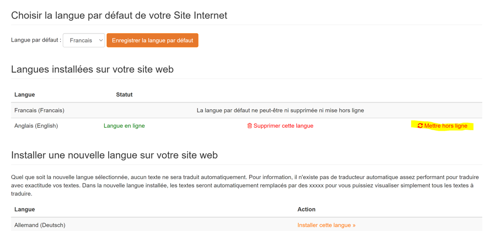3. La langue est installée. Par défaut la langue est visible sur votre site mais vous pouvez la mettre hors ligne (en cliquant sur le lien de couleur rouge Mettre hors ligne) le temps de saisir tout le contenu dans la langue sélectionnée. N'oubliez pas une fois toutes vos pages traduites de revenir sur cette page pour remettre en ligne la langue sélectionnée (en cliquant sur le lien Mettre en ligne).