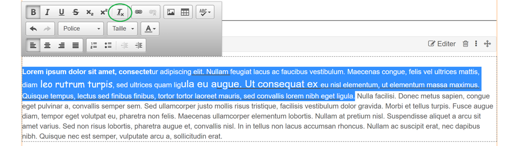 Une page n'a pas la même police ou une taille différente que les autres pages de votre site. Cela peut se produire par exemple suite à un copier/coller car la mise en forme est répliquée ou parceque vous avez appliqué plusieurs modifications à l'aide de l'éditeur de texte. Vous souhaitez supprimer la totalité ou une partie de la mise en forme de votre texte, suivez les étapes ci-dessous :